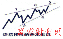 推动浪中的例外情况,终结楔形浪形态如下,以两条汇聚线内的楔形出现,仍然可分为5个子浪