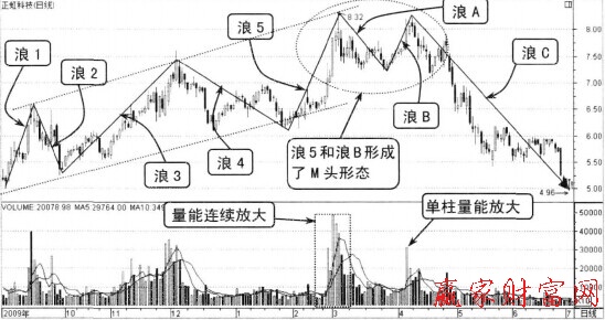 图所示为正虹科技在2009年9月至2010年7月的走势。在图中出现了一个典型的M头形态,即虚线圆圈标注,它是由浪5的顶部和浪B的反弹顶部共同构成的。