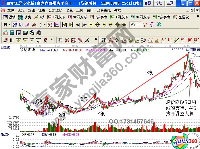 (3)第三浪。第三浪通常是最大、最有爆发力的上升浪,并且这段行情的持续时间和幅度是最大的。投资者信心恢复,成交量大幅度上升,常常会出现传统图表中的突破信号(由赢家财富网www.yingjia360.com提供),像是裂口跳井等等。