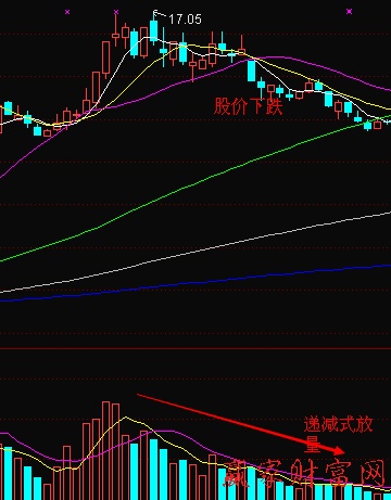 图中很明确,股价顶部震荡放量,但是量能趋势却是在逐渐减缓,说明主力出货基本完成,主力手中只剩少许筹码,没有人再去维护股价,股价便逐渐下跌,量能也逐渐减小。虽然量能相比其它区位还是很大,但成交量呈现出的是萎缩趋势,后市不容乐观,实战中应当敏锐的把握抛出点。