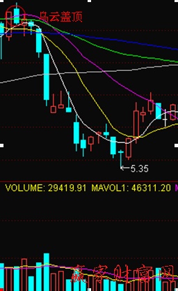 如图,乌云盖顶出现后伴随放量,随后股价便开始大跌,此图很形象的为我们展示了顶部出现乌云盖顶放量的可怕,必须马上出局。