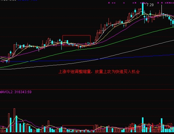 在上升趋势中个股出现了盘整或震荡,此时对应的是缩量回调,那么就是上涨中的很好的买入机会和加仓机会。在江恩理论中曾讲究的是一种配合,就比如成交量与股价的配合。又比如均线理论中的均线和K线形态的配合。