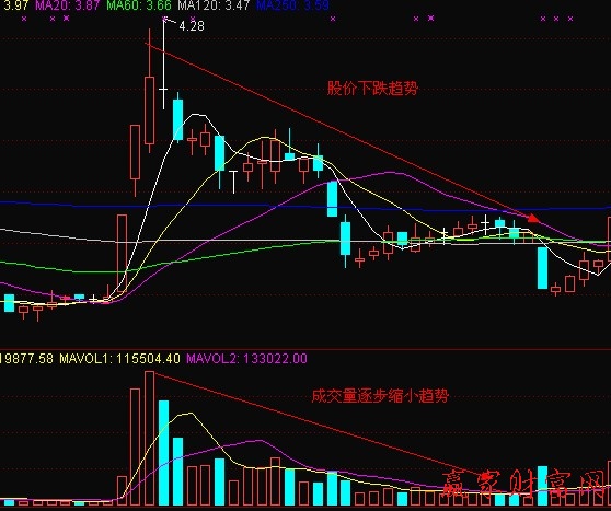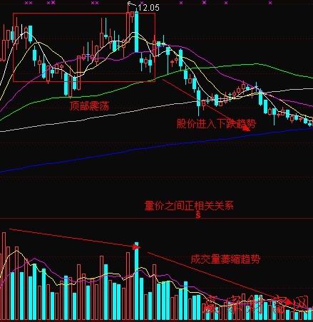 上图中个股在顶部时其震荡比较剧烈,通过日K线就可以看出个股当时必然是上蹿下跳,同时成交量放大,是一种最明显不过的顶部出货形态。随后股价逐步下跌,成交量逐步萎缩,形成一种量与价的正相关的量缩价跌。这种下跌很有效,是正常情况下的下跌,不可逆势而为。