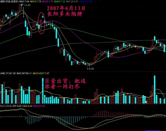 所谓空头陷阱即是指股价在低位区域突然出现的向下突破的假象,如突破了长期均线等的支撑,并伴随着各种利空的消息。由于担心市场再度大跌许多的投资者在恐慌当中卖出了手中股票。随后市场却是不跌反涨,一波牛市行情重新开始了。随着股价的上涨,成交量也是不断的放大,并且股指突破了重要的阻力线。这时侯就可以将前面出现的向下突破的走势看成是引诱空头做空的陷阱。那些在低点清仓或者是不敢补仓的投资者,就成了空头陷阱的受骗者从而踏空了一轮行情。