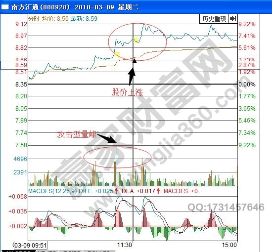 下面我们来看一则实例南方汇通(000920)在2010年3月9日的分时图走势变化,从图中可以看出随着股价的上涨变化,成交量在不断的方法,而且相继出现了3次放量,(声明:版权归赢家财富网所有,严禁非法转载,若非法转载将会有法律责任追究,后果自负!)所以对应的股价也形成了明显的阶梯式的上涨变化,其形态类似与我们常说的攻击性量峰结构,这个时候预示着阶段性的买卖点,而投资者要做的就是依据大单的活跃程度以及换手率的高低进行分析,当股价处于低位的时候,可以适当的买进,如果是在高位要防止主力对敲出货,做好离场观望的准备。