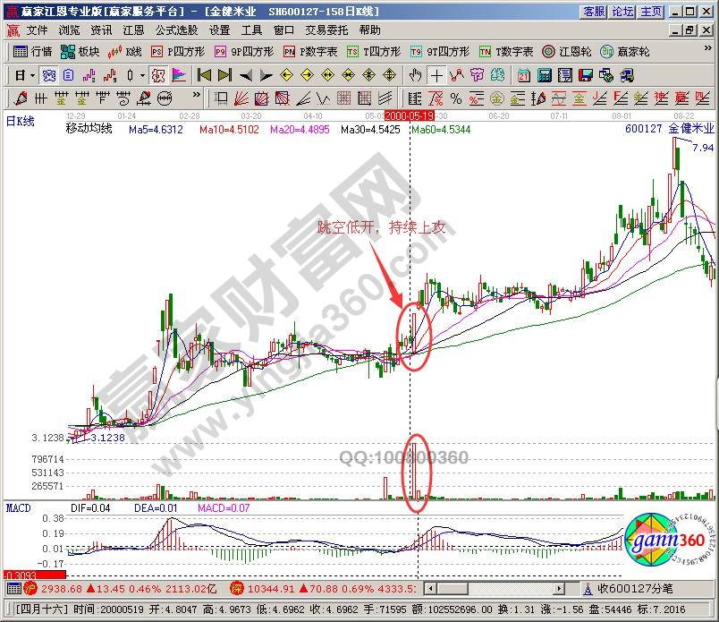 600127 金健米业在2000年5月22日,其均线系统发生黄金交叉现象,面临向上突破和向下破位的选择时,大幅度低开,成交量一笔就达到了1000多万股,这种集中放量的现象,实在是太过罕见,所以购买的投资者大量买进,因此出现这种情况,所以这也就是我们今天讲的“一口价成交”现象。该股在历史巨量大幅低开之后,有一点很关键,就是低开之后很快就发力上攻,迅速的翻身,经过之后多空双方的一场激励的交战,最终多方获胜,这也能显示出多方能量爆发的威力,但是这也暴露了多方心中继续上攻的意图,所以,该股后续便一路攀升,呈现慢牛的形式,涨幅很可观。