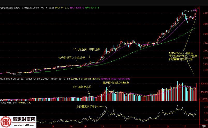 在14年的下半年的时候,当时个人认为这轮牛市比07年的牛市跟家生猛,当然就是依据在这个过程中的不断的观察成交量和换手率的变化情况,可以说从14年7月开始的时候,成交额和换手率都在不断的上涨。