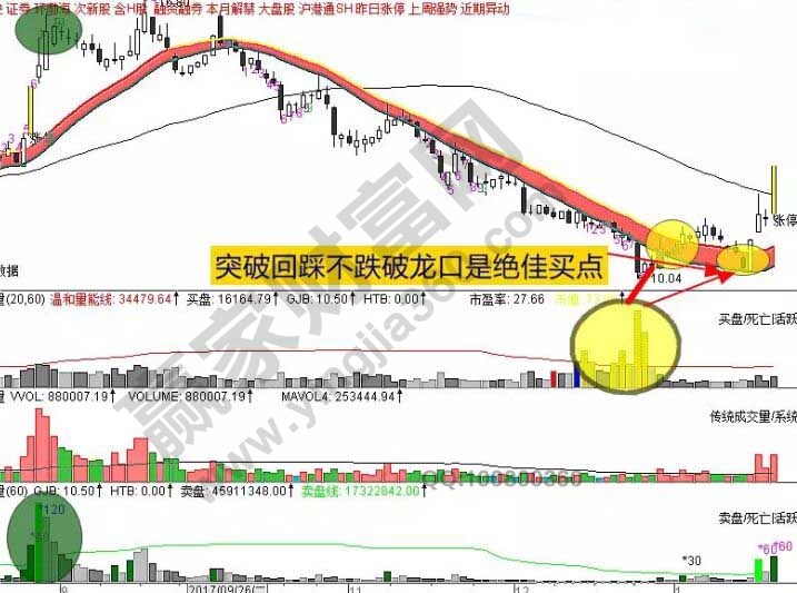 一般买盘放量后,股价突破上颚线后会有回踩,这个时候卖盘成交量放30日之最视作洗盘可不卖,如果放量超过60日之最就卖出。碰见回踩不破龙口下颚线的可以选择这里加仓,也可以选择在再次突破龙口上颚线时候加仓。如下图所示。