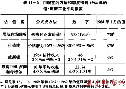 但在1955年,传统的估价方法好像最后一次发生了偏离。尽管自那以后股市发生了三次下跌──1962年的一次接近恐慌──但市场在9年内再也没有回到用这一传统的、时间试验度量方法决定的“适当”水平。让我们看一下根据传统的方法,在1964年初“正确的市场水平”应该是多少。在表11-1,我从这些方法中选出了4种,给出了由其得到的1955年初和1964年初的数据。