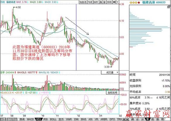 2010年11月 福建高速(600033),主力对套牢密集区通吃,进而开始大幅拉升股价,涨幅累计达到了80%以上。当股价处于高位之后,又经过了充分的换手准备,大部分筹码已经从低位陆续转移到了高位,这就说明在高位主力已经开始了筹码的派发工作。当筹码被主力派发完毕之后,股价就形成了下跌之势。