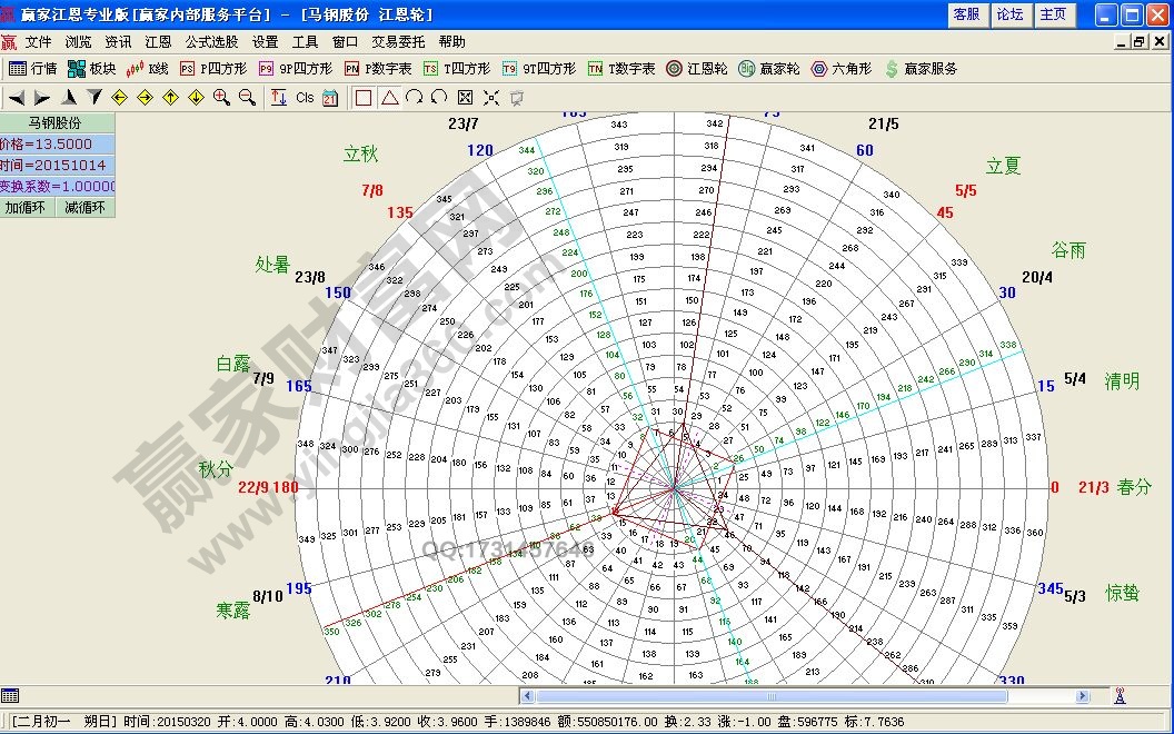 上图是,赢家江恩软件中的赢家轮工具,其实它与接下来笔者所要讲的趋势结构的买卖点判断原理是有一定的相似性的。对于绝大部分的投资者来说,对于趋势结构,并不能有一个很好的认识。笔者认为,一个完整的趋势结构,是一定要形成一个360的走起循环在轮回的九宫图里面的。为什么趋势结构要形成这样的图呢?笔者这么所当然是有一定的理论依据。它就是依据于一些数学机构和360的圆周率。下面为大家公布一点这些数字结构与360圆周率关系。