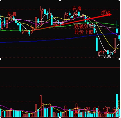 头肩顶在上升途中出现了三个峰顶,这三个峰顶分别称为左肩、头部和右肩。从图形上看,左肩、右肩的最高点基本相同,而头部最高点比左肩、右肩最高点要高。另外,股价在上攻失败向下回落时形成的两个低点,又基本上处在同一水平线上。这同一水平线,就是通常说的颈线。当股价第三次上攻失败回落时,这根颈线就会被击破,于是头肩顶正式宣告成立。