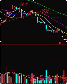 如上图个股,股价上涨遇阻逐步形成了双顶。两个顶部基本上相近。在第一次见顶遇阻后,获利筹码了解获利,造成盘面承压,股价下跌,下跌一定幅度,得到支撑,股价开始继续上攻,但是第一次承压的价位第二次依然抛压严重,同时主力借机出逃,最终股价上攻失败回落,行成了双顶。此时看到双顶将要形成,就要减仓,待到股价跌破图中所画颈线时应当全部清仓。如果被套还要止损出局,防止损失扩大化。