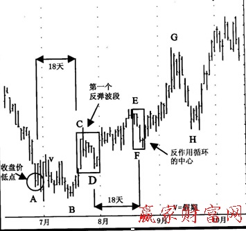 上图中从C到A的逆向计算是18天。记住,在7月份有1天的交易日假期要计算在内。现在进行向前计算。记住,向前计算的计数,是从反弹波段收盘价最低点(D)的右侧第1个价格棒算起,向前数18天。在图中,就数到从E到F 的新反弹波段结束的收盘价低点。这个从E到F的反弹波段就是反作用循环的中心。实际上,根据向前计算,在从E到F反弹波段结束处所得到的反转时间,是告诉你市场准备再一次向上攀升,是调整结束买入的做多的时机。在中国的A股市场中这样的上涨过程的调整形态非常非常见,往往对应的是局部顶部震荡形态,是上涨中的积蓄力量,为后市的拉升提供更大潜力。