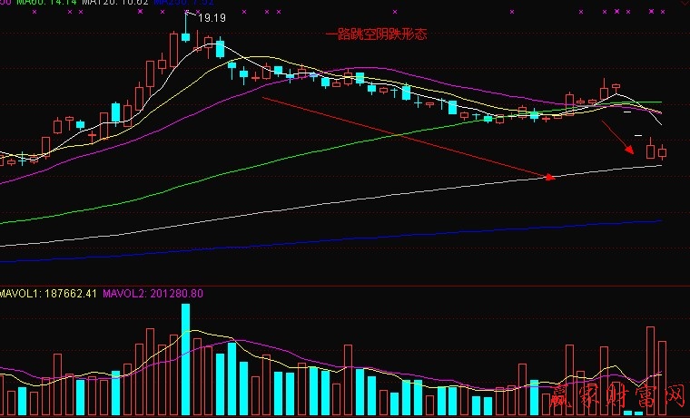 持续跳空低往往是一种连续的阴跌方式,所以只有达到底部缩量震荡,然后温和放量上涨时才是买入的大好时机。比如下图所示的又一连续跳空的阴跌形态: