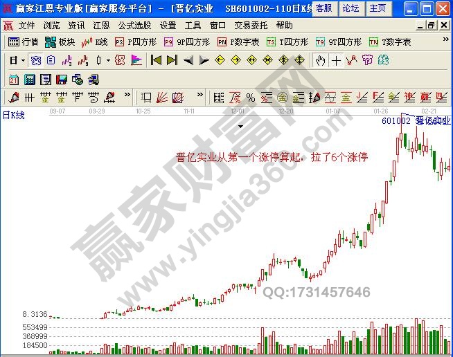 如图1所示,高铁概念股票晋亿实业(601002)从2011年1月19日第一个涨停算起,直到最高价共拉了6个涨停。(文章来自赢家财富网http://www.yingjia360.com)