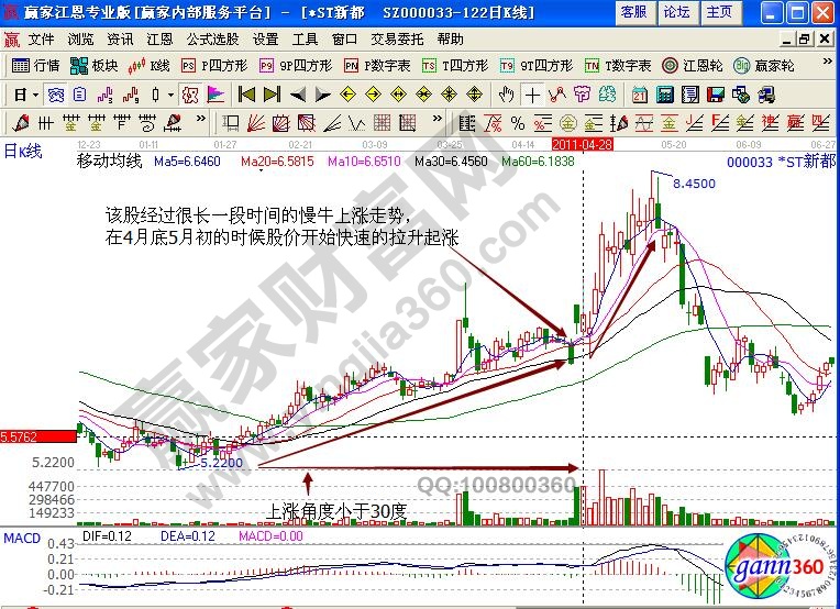1、股价走势缓慢的震荡上行,上涨的角度要小于30度;