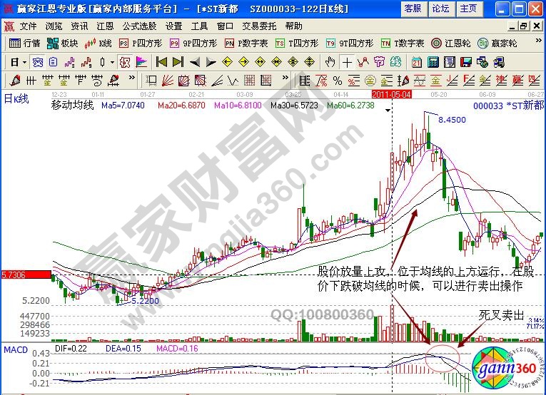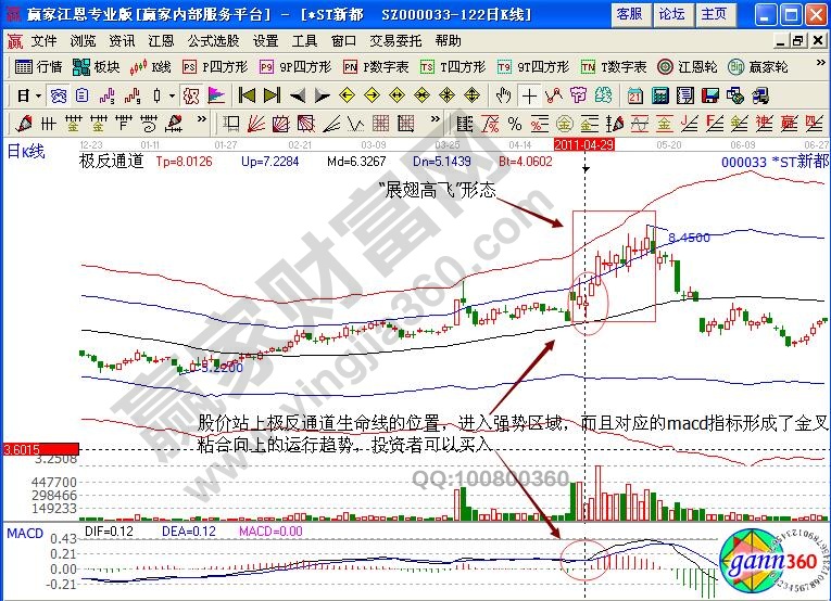 对于该买入形态的判断,可以借助江恩软件中的极反通道工具进行分析,可以看出在5月3日的时候,股价不仅仅是突破了均线的走势,而且是站上了极反通道生命线的上方,处于股价上涨的强势区域,是可以进行操作的,再加上技术指标走势中macd形成的金叉买入形态,是一个稳健的买入点位置。