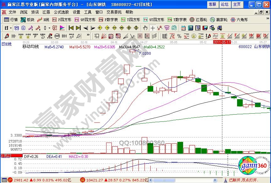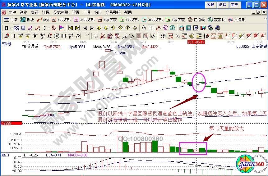 首先来研究山东钢铁在11年的股价走势变化,如图山东钢铁(600022)在2011年5月份的股价走势,前期股价经历一波快速拉升的上涨变化,在5月份的时候进入下跌的小幅整理走势,在5月17日出现了阳K线十字星的形态,很可能是预示着变盘的操作信号,而且形成了阳量柱,并且股价在均线的下方运行,如果第二天的股价走势不是很强势,或者是没有反弹向上运行,就必须要考虑及时的卖出获利。