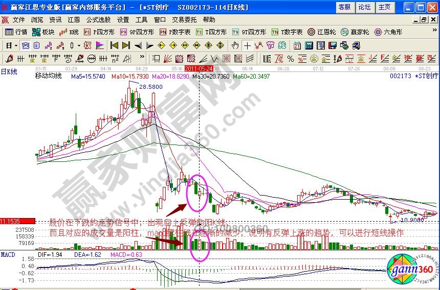 其次,我们对比观察ST创疗中的股价走势,看看有什么相同之处与差异,如图ST创疗(002173)在2011年5月24日股价走势,经历了一个向下跳空的大幅缺口,之后反弹上涨并再次下跌,24日出现上涨反弹信号,是阳K线的走势,对应的成交量形成了阳线柱,macd指标中的绿色柱线在不断的减少,说明有反弹上涨的迹象,可以进行超短线的投资操作,投资者在下跌的走势中,应该掌握抓反弹的操作技巧。
