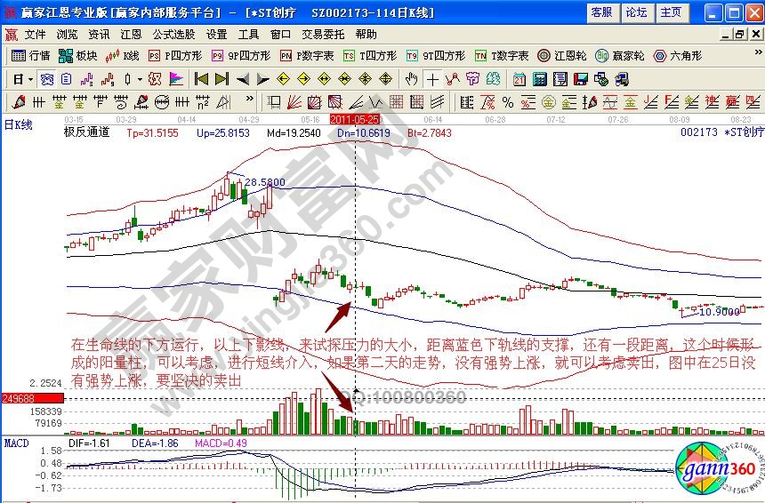 对比在极反通道中的走势进行分析,股价在生命线的下方运行,以上下影线来试探上方的压力和下方的支撑作用,距离弱势区域蓝色下轨线还有一定的距离,这个时候形成的阳量柱,可以考虑进行短线介入操作,如果第二天的走势没有强势上涨,就可以考虑卖出,图中显示的在25日是阴线十字星的走势,预示着可能再次变盘,由于次日的走势不是很强势,必须要坚决的卖出。