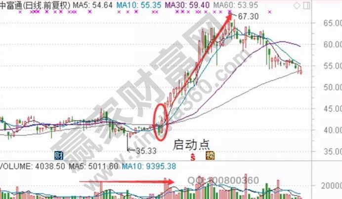 这个右上角强势进攻型的股上涨利润空间是非常大的,如下面的中富通走势图。股价的启动点在短期线金叉中轨后放出三倍量平台突破,这种票的爆发力来自前面箱体或者平台的拉锯洗盘的蓄势,止损以短期线作为保护即可;一般来说股价在右上角附近徘徊获利与解套的风险压力较大,但是反作用力也大。
