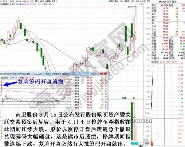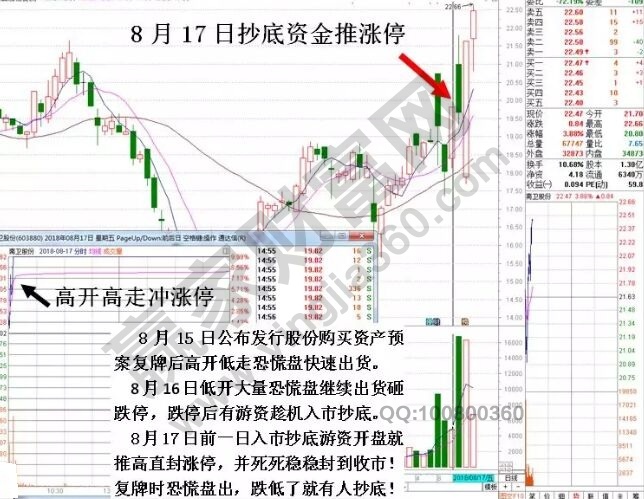 该股在8月15日复牌,股价以涨停开盘后遭遇急于撤退兑现筹码大幅砸盘,这是熊市后遗症,停牌期间指数连续下跌,复牌开盘必然有大批筹码开盘就出。所以当天走势是高开低走,次日开盘就大幅度杀跌一度封死在跌停板上,此时恐慌盘已经不管利好利空,先出来再说才是最大的诉求。在跌下来之后有资金入市抄底,跌停打开后股价回升,股价升跌明显受买卖量以及态度手法直接影响的。该股在8月17日抄底资金就推涨停,如下图所示。