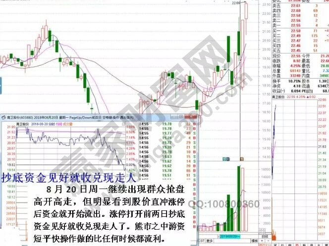 在8月20日,周一继续出现抢盘高开高走,但明显看到股价直冲涨停后资金就开始流出,涨停打开前两日抄底资金见好就收兑现走人了,熊市之中游资短平快操作的比任何时候都流利。如下图所示。