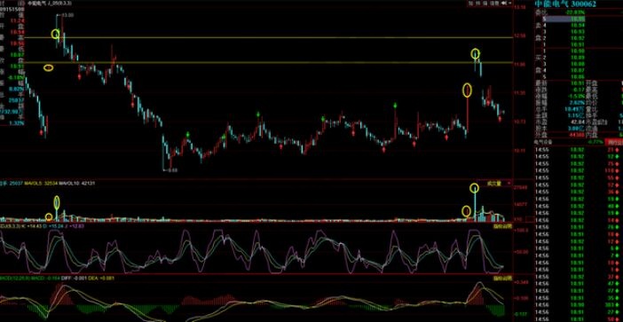 我们来看中能电气的走势图,从这个走势图分析,我们可以看到,涨停对应阳量,高开低走对应的假阴线对应的是阴量线,阳量上涨后出现阴量线对应股价高开低走,这就说明阳量线之前数根K线介入的资金都是有出逃机会的,所以走势上形成了阴克阳走势,短线应该进行规避,后期以下跌为主。