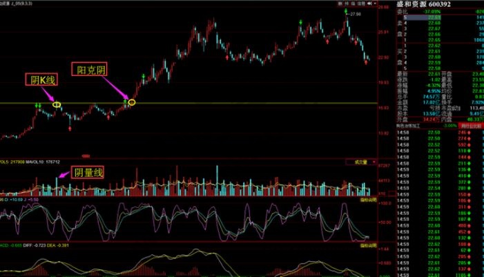 在它的走势中我们可以看到:股价高开低走形成假阴线下跌走势,对应成交量形成阴量线走势,后面几根K线走势没能站上阴K线最高价,后面出现几天连续下跌走势,当出现小倍阳上涨突破这根阴K线时形成阳线突破的阳克阴特征,显然是非常好的买入信号。