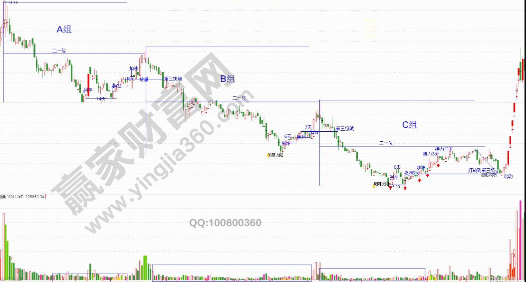 看到上图,可能有朋友就会问:为什么要第三组才会启动?我们每一组的共同点就是,三组底部都有刹车换挡的动作,都有低量群,都是反弹到中周期的二位一喜爱跌。不同的地方就是底部构建C组是比较紧凑、稳健、第三级没有破位。所以财货到第三组启动。
