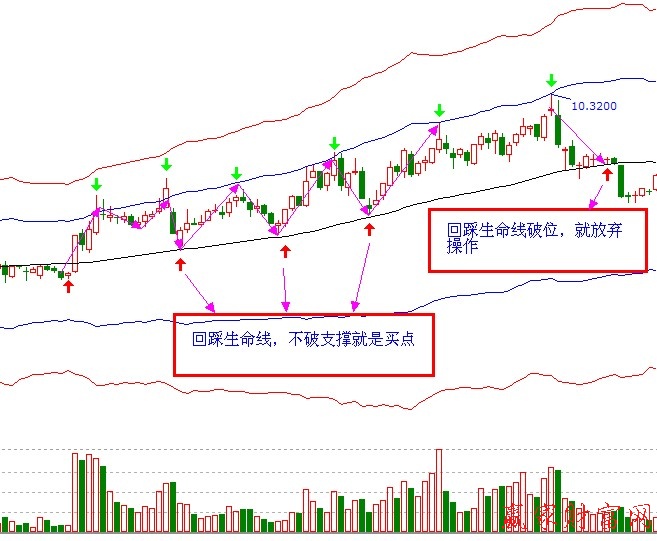 2. 股价站上20日均线,在后期会出现一个缩量回踩的整理态势,但是股价还是牢牢站在10日均线之上,我们称之为“回踩生命线”,之后股价在当天或是次日再一次急速拉升,回补掉前一天的阴线,这就叫“杀阴起涨”,也也是短线买进的最佳时机了。