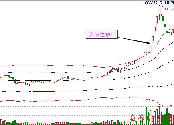 案例:美邦服饰(002269)向上跳空高开,形成一个突破性缺口,激进买点出现。短期获利颇丰。