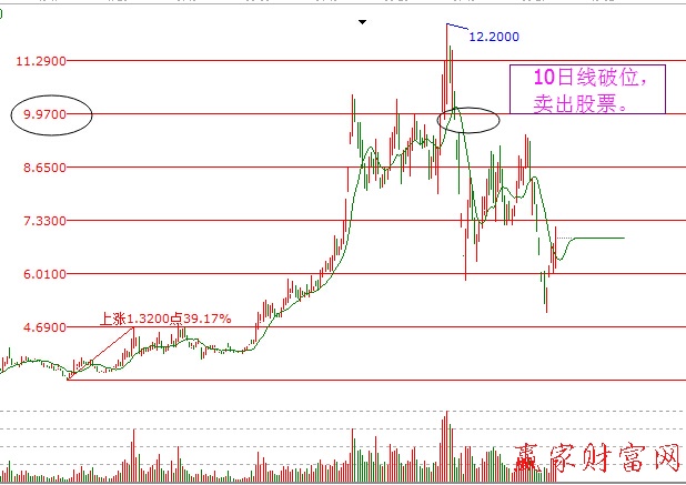 10日移动平均线可以认为是短线操作的卖出点。股价破位10日均线,指标拐头向下,是短线的卖出信号。同时配合macd指标进行判断,及时卖出股票,规避不必要的风险。在操作的时候尤其要注意K线形态的配合,如果对价格空间把握的较好的话,可以在高位适当减仓,并且在10日线附近设定止损。