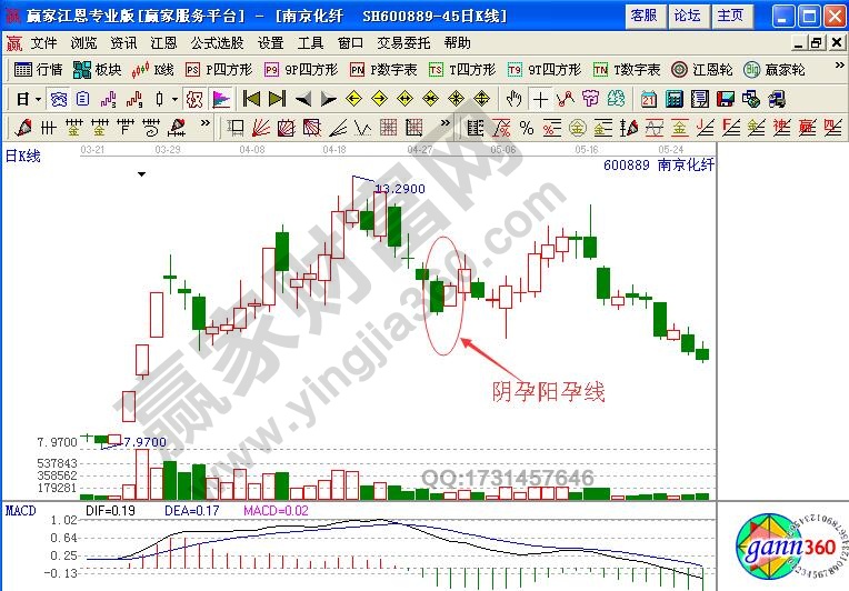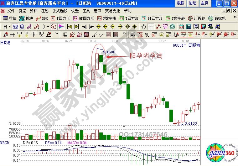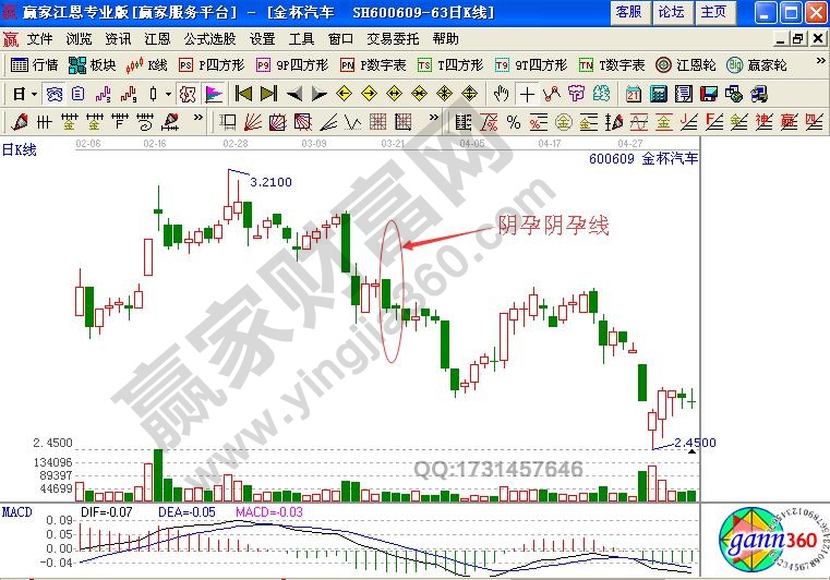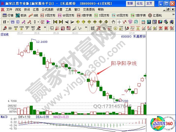 低价位孕线是买入提示信号。低价位孕线分“阳孕阴线”、“阴孕阳线”、“阴孕阴线(如图所示)”、“阳孕阳线(如图所示)以及“十字星孕线”等好几种形态。在低价区,上述几种形态均为买入提示信号。但需要说明的是,低价位的孕线虽多是可信的买入点位,但要严格分析,孕线是不是真正的低位态势,若是那些处在下降途中的孕线,则是继续卖出的提示信号;(本文版权归赢家财富网www.yingjia360.com所有,严禁非法转载,转载请注明出处。)而处在双底走势右底低点处的孕线则是强烈的买入信号,短中线投资者均可在此建仓做多’如果高位出现孕线则是明显的见顶信号。