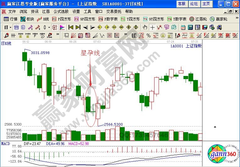 概括来讲,孕线形态表明了市场在其前后键康状况的明显反差。在牛市行情中,孕线形态中前面一个长长的白色实体即表明了市场本来充满着活力,但是,后面一个小实体却反映出市场的犹疑不定。这说明反弹功能正在衰退,极有可能出现趋势反转;反之,在熊市中依然。因此,孕线形态还有可能构成趋势反转的信号。