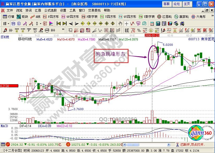 上图是南京医药在2006年1月份至3月份的走势图,图中显示,该股在2006年1月23日的时候,形成了“狗急跳墙”形态。。该股股价在经过拉升之后进入的急涨的阶段,突然在23日的时候,股价突然的大幅跳空高开,并且是放量上涨。