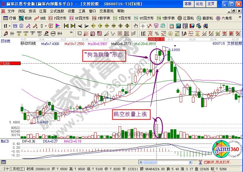 上图是文投控股在2008年1月分的股票走势图,图中看出在1月10日的时候,股价在经过了一段的拉升之后,进入了急涨的阶段,在当天该股跳空高开,放量上涨,同样的形成了“狗急跳墙”形态。这也同样的说明了,背后主力庄家的进行派发的意图。所以,当我们持股已经获利,而股价已经在相对的高位的时候,出现此种形态,就要有卖出的打算。通过上面两个例子的介绍,“狗急跳墙”形态特征总结如下。