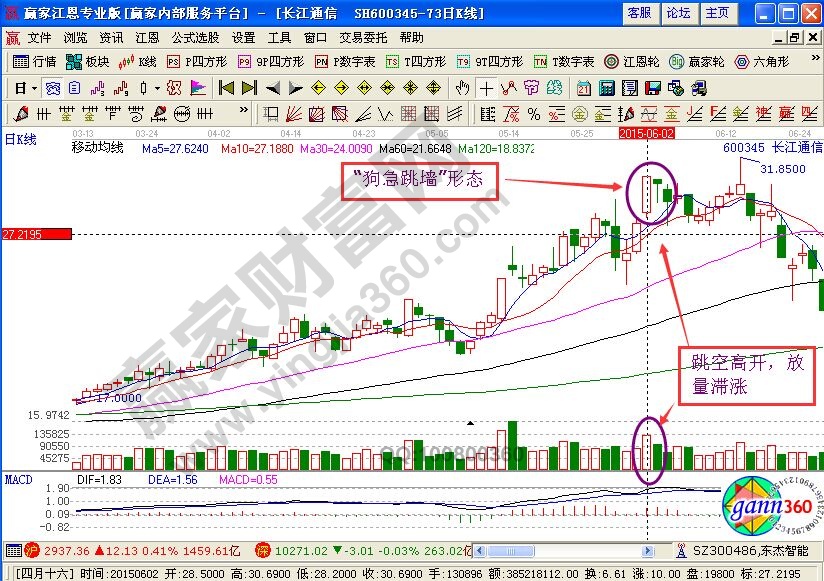 上面这个特征是“狗急跳墙”形态最明显的特征。该形态一般是主力庄家进行诱多的一个陷阱,接下来的走势很可能就是上涨的最后一棒。在经过拉升之后,在高位所留下的向上提空缺口的带量阳线或阴线就是“狗急跳墙”形态。