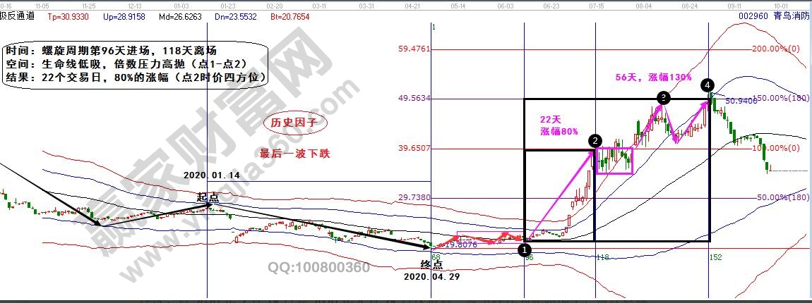 再看青鸟消防002960。持续的下跌行情在19.8止跌反弹来到生命线附近。以2020年1月14日至2020年4月29日这波下跌为起始因子做江恩螺旋时间周期线,并以19.8低点做江恩价格百分比(只留50%分割位),调出极反通道即可得出下图。该股自点1起涨指点2高抛,22个交易日,涨幅达80%,此段走势与青农商行如出一辙。螺旋时间遇到倍数价位39.65高抛离场,但之后震荡靠近蓝色上轨线后,继续维持强势,最终在点4形成四方(152天+1.5倍价格)转势下行至当下。是的,点1至点2是必须装进兜里的,点2至点3至点4是市场赏的,属于对趋势有精进研究的投资者。想抓到点2,还想抓到点4,那就请再努力努力!