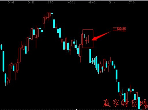 三颗星又称为下跌三颗星。其特征是在股价下跌行情中,大、中阴线后K线图上出现连续三根小阴小阳线,股价上下波动很小,这就构成了“下跌三颗星”。它的出现表明市场仍处于弱市,股价仍有继续下探的空间。因此投资者见此K线组合应做好立场准备。