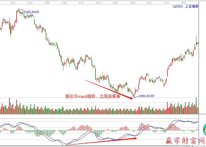 当股价或指数逐波下行,而MACD的绿色柱子或两条线不是同步下降,而是逐波上升,与股价走势形成相反的走势,这便是“底背离”预示着股价即将上涨,则股价即将大幅度上涨。