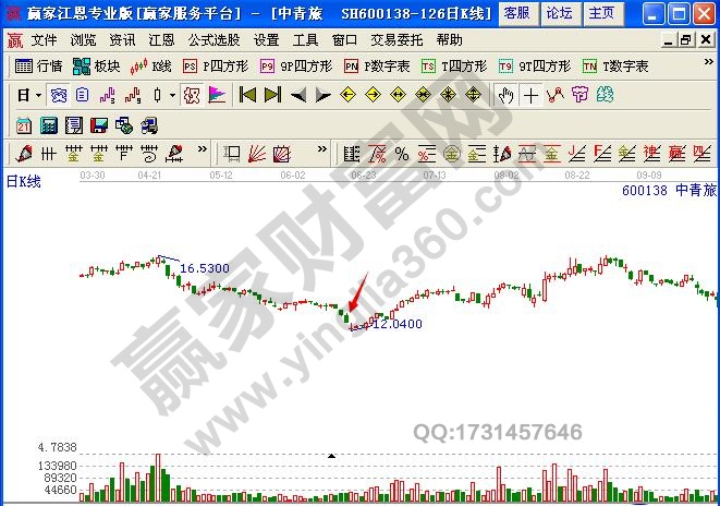 图2所示的中青旅,就是在尾盘进行了大幅的打压,以测试持股者的信心以及盘中的恐慌筹码大小。从图3所示的K线图中可以看到,当时正经历一波较大幅度的下跌行情,而当时又连续收了三根阴线,此时,持股者就不应该再盲目杀跌,而应该冷静分析,这种急跌是什么原因造成的,又隐藏着怎样的玄机。从其长期K线图来看,这时连续三根阴线,成交量并不算大,出货的可能性基本上可以排除。那么既然不是出货,就应该考虑是不是主力在进行探底,如果是的话,那么一旦探底成功,就将会出现一波较大幅度的反弹。因此,如果在较低的价位出现这种尾盘打压的话,投资者不妨哲时观望,一旦股价开始有反弹的迹象就可大胆入市。