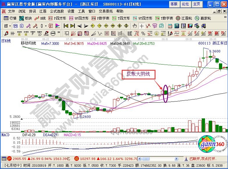 通过上面的两只股票的走势图,我们可以总结到反叛大阴线的具体的含义。它指的就是行情正式暴涨之前空头的最后反扑,或者在上升趋势运行途中突然出现的反叛型大阴线,通常这样的大阴线会被一口口吃掉,如果发生的同时伴随着巨大的成交量,往往是对上升趋势结束是一个预警,提示头部就在前面不远处!