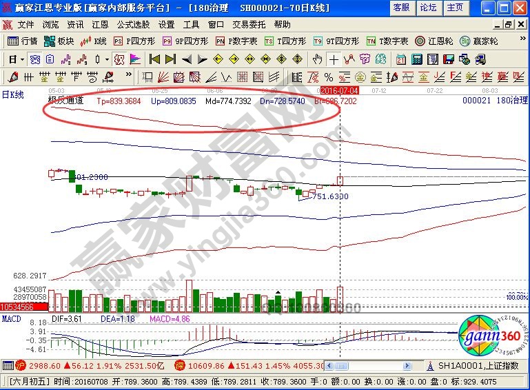极反通道是赢家江恩软件中的特色指标工具,它是一个趋势指标,而且它是一个万能指标,是和短线、波段以及中长线操作!该指标可以从分显示股价趋势的强弱,买卖双方力量平衡变化,是目前中国投资市场中集趋势研判、买卖点提示为一体的工具,它主要的买卖点判断就是支撑与压力的判断!一共有五条线,具体的用法,可以参考本网站的极反通道栏目去进行详细学习!