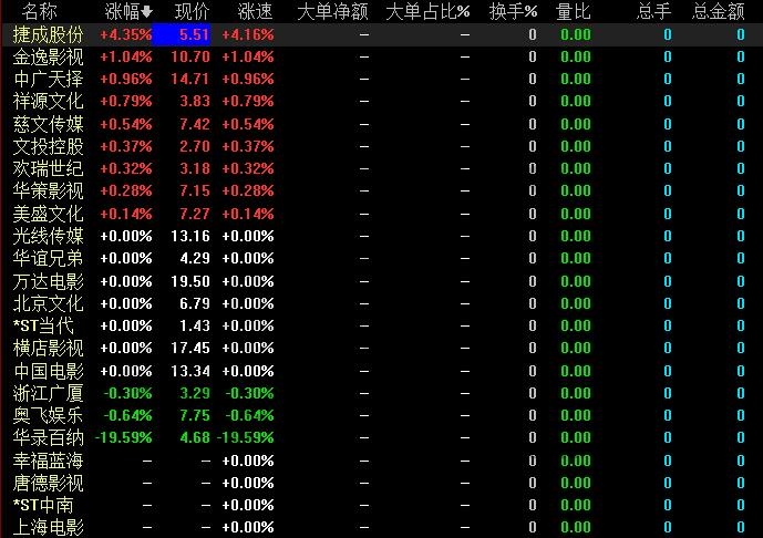 金逸影视一度触及涨停,收盘涨幅4.45%;上海电影也是一度涨超8%,收盘涨幅5.42%;除此之外,唐德影视涨停;*st当代涨停;影视行业龙头华谊兄弟也上涨了3.07%;中国电影享有进口影片引进权,上涨了2.29%;而万达电影作为我国最大的院线公司上涨了2.13%。