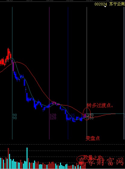 首先在时间点上,赢家江恩自定义周天江恩时间循环线对时间变盘点的预测很准确。如图中所示,股价在顶部大跌前,江恩时间爱你循环线已经显示出要变盘。包括随后的下跌中的整理反弹,都出现在江恩时间循环线处。首先从这一点上已经充分证明了江恩时间循环线的变盘预测准确性。而如今股价又到了江恩时间循环线150度处,股价将在此位置变盘。这个变盘点我们已经找到,转多还是空接下来利用乾坤K线分析。