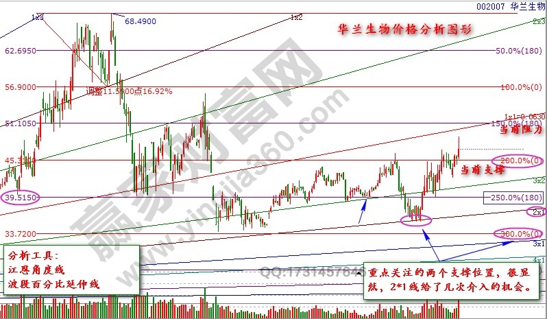 华兰生物(002007)是我们一直以来关注的股票,对于关注本站的朋友也能从该股的长期追踪中看明白笔者对该股的把握,市场的走势完全取决于其历史的走势如何,我们在分析的过程中,严格的利用江恩工具来进行的判定,严格来说是重点展示的江恩角度线,通过对市场走势的把握,计算出市场波动规律,从而判断市场的走势。在先前的分析中,笔者曾提醒该股的操作机会,而该股在近期的表现也是有目共睹,连续反弹超过35%的幅度。那么我们接下来,结合历史,研究下该股未来股价的走势到底是怎么样的。