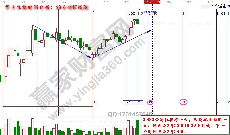 综上,短期关注该股的朋友需要重点留意的位置是,支撑位:200%分割位45.31,生命线42,破位下寻角度线3*2线及250%分割位;阻力位:1*1角度线、蓝色外轨线和150%分割位,价格51附近。结合时间点2月22日和24日。严格根据时价关系,做出买卖决策。