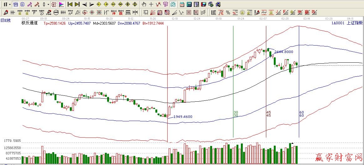 综上所述:大盘处于极反通道生命线上方,按照极反通道法则:极反通道生命线不破看高至极反通道蓝色上轨2457。